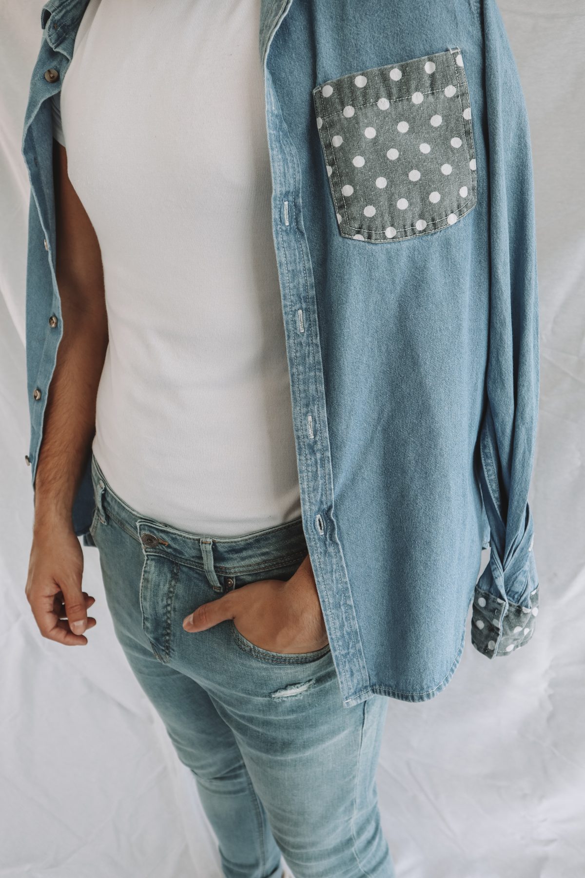 Padrões, patches, ganga desfiada, dobrar as calças/camisas: detalhes que podem alterar completamente o look. Neste caso, o tom verde da camisa combina com os dois tons de ganga do casaco e das calças. E o casaco, que tem um corte biker com algumas tachas e fechos na manga, torna este look mais edgy.
